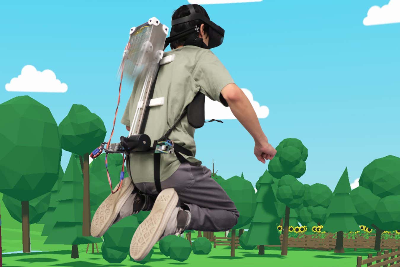 A mechanical backpack can enhance the sensation of jumping or falling in virtual reality by sliding a weight up or down.